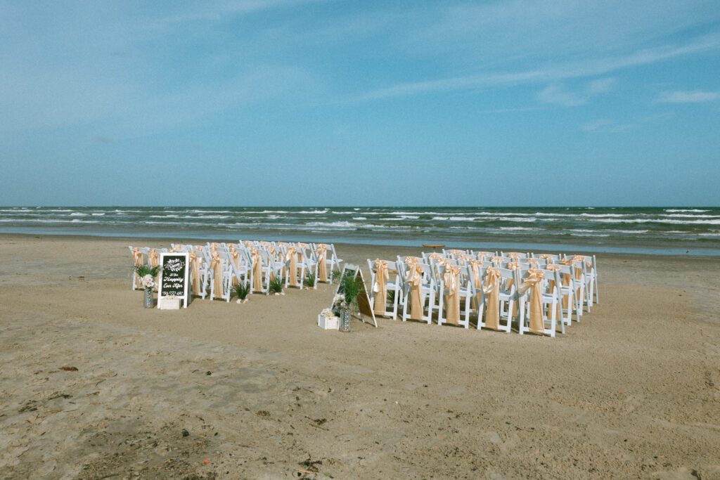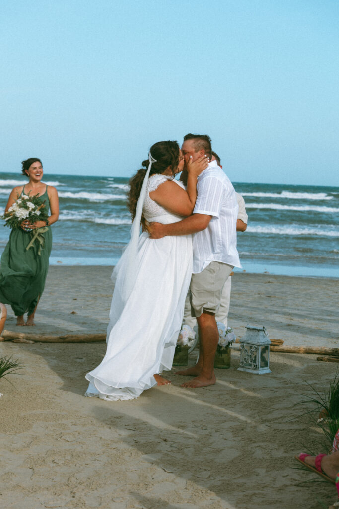 Tana and Hunter’s intimate Port Aransas beach wedding unfolded on a warm August afternoon. They invited only their closest family and friends, creating a relaxed and heartfelt celebration beside the Gulf. Soft dunes framed the shoreline while the sound of waves set a gentle rhythm for the day.